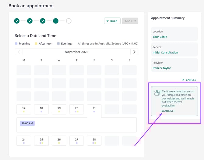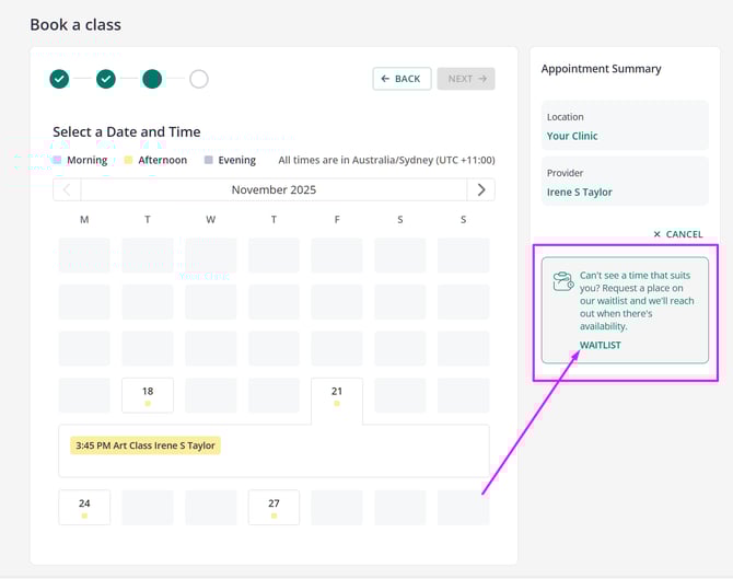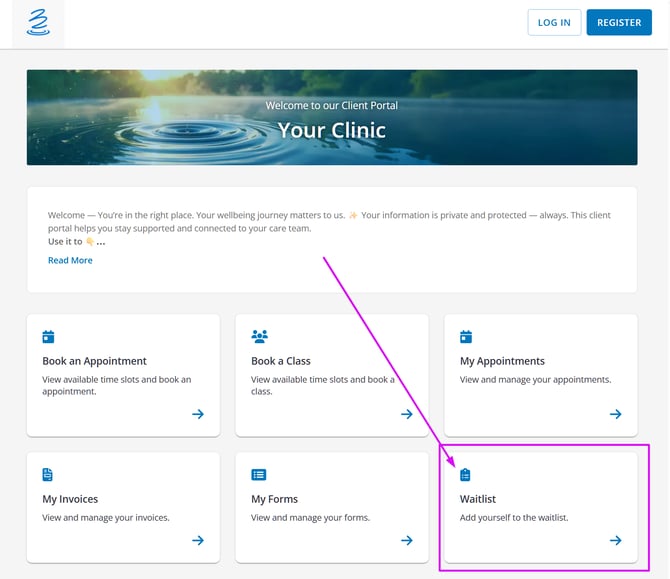 Your existing and prospective clients can easily add themselves to your waitlist directly through your client portal. To do that,