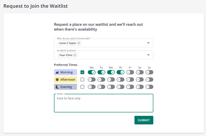 Accepting waitlist requests through your client portal gives your clients a simple, convenient way to let you know they’re waiting for an appointment — without needing to call or email your practice. This enhancement helps you capture demand more efficiently, link requests to client profiles automatically, and reduce manual admin for your team. In this article, you’ll learn how to enable waitlist requests on your client portal, what the experience looks like for clients, and how to set up automated notifications to keep both your clients and your team informed whenever a new request is submitted.