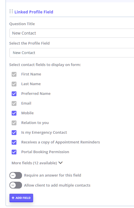 The New Contact field is available as a Linked Profile Field, which means the information collected from the online form is saved directly to the client’s profile in Zanda.