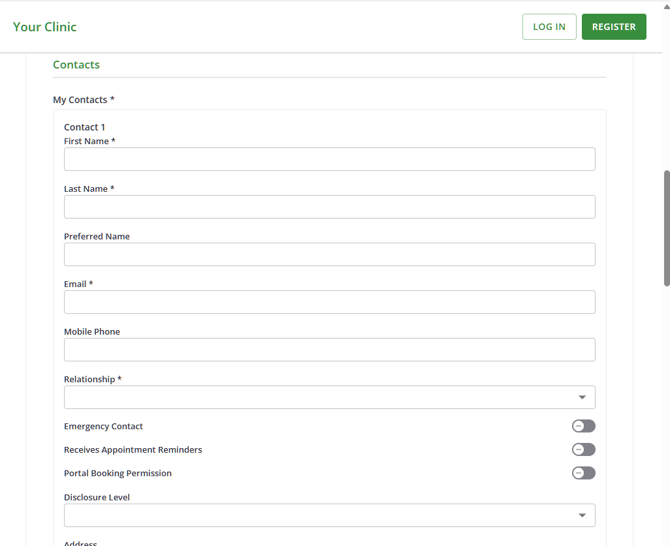 When completing a form that includes the New Contact field, clients will see a contact section labelled with the name you configured (for example Contacts).