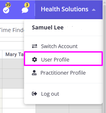 1. When logged in, click the account business name in the top right-hand corner and select 'User Profile'.