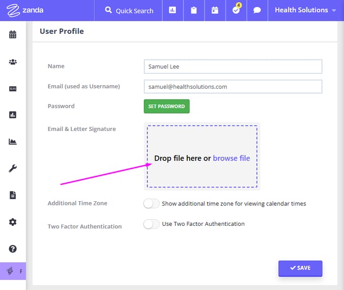 Learn how to upload your signature to your user profile and use the user signature merge field in email or letter templates in Zanda.