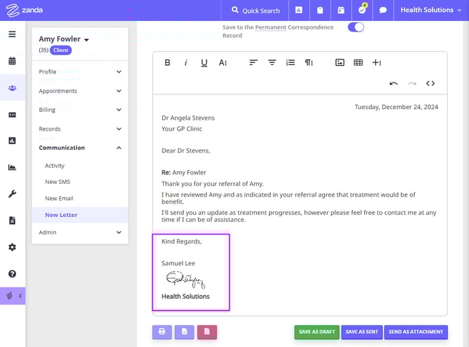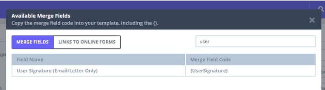- When you create an email or a letter for a client using a template that contains the {UserSignature} merge field, the system will automatically merge your signature image for you.