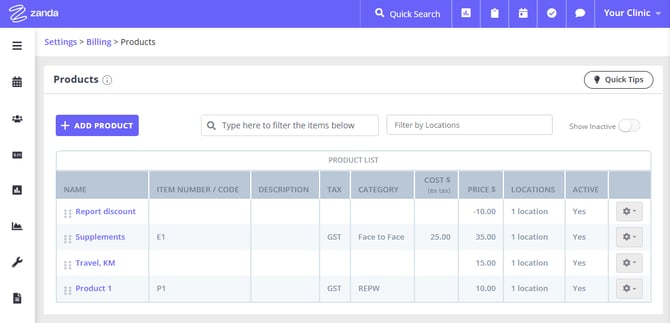 Products are the tangible items you sell to your clients in your health practice. You can add a product to your Zanda account to invoice it to your clients. A medicine for removing acne, a video course on assertiveness training, and an ebook on effective dieting, are all examples of products you can add to your Zanda account.