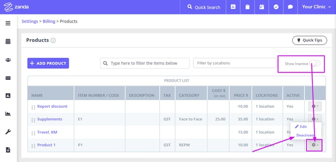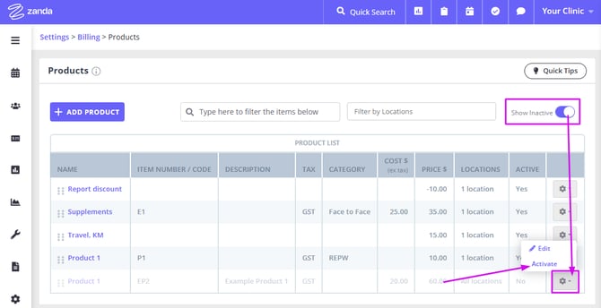 1. Toggle the Show Inactive switch on. This will show you all the products you’ve deactivated.