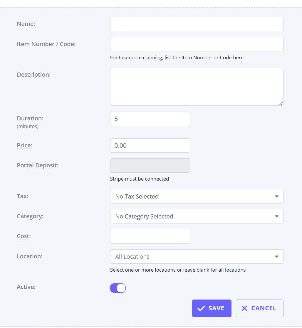 - Portal Deposit: if some amount is set up here, clients will be required to pay it when booking this service online via the Client Portal. You must connect to Stripe to be able to use this feature.