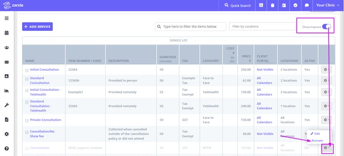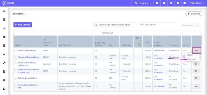 - Once a service is deactivated, it won’t show up in the Services List inside appointments, invoices and the Client Portal.