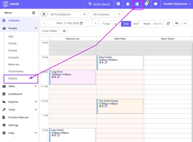 1. Using the left-hand menu on Zanda, navigate to PEOPLE > Waitlist. Or, click on the Waitlist icon on the top panel.