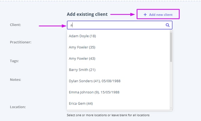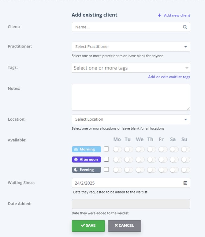 Please be mindful that this will only create a new client profile. If you need to add a new shared profile, do this via People > Add. Then you'll be able to add a shared profile as an existing client to the Waitlist.