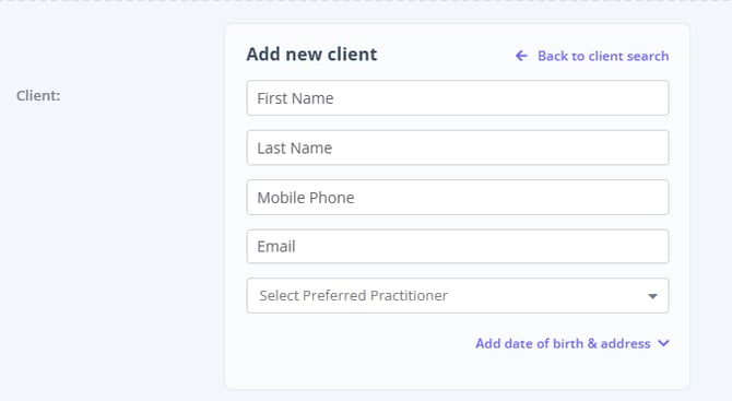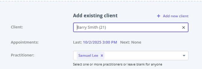2. Practitioner: If there are multiple practitioners in your clinic - each with their own calendar in your Zanda account, this is where you can assign the client to them. This setting is particularly useful if the client requests, or was being treated by a specific clinician in your clinic.