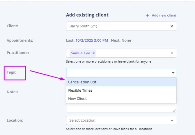 3. Tags: Add one or more of your custom Waitlist tags here, to classify, group or identify your clients.