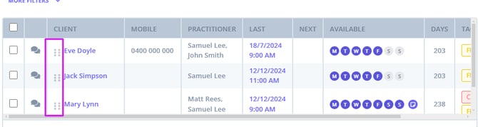 You can organize your waitlist by adding or removing the columns and moving clients up/down the list to change their order of appearance.