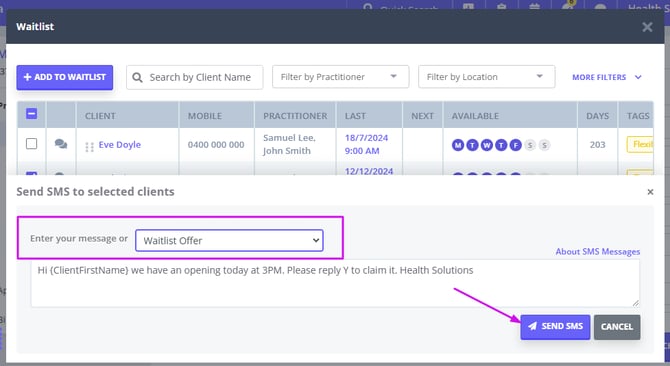 - When an appointment is cancelled or rescheduled by a practitioner on the main calendar screen, the system will look up for matching Waitlist clients using their Waitlist preferred Practitioner(s), Location(s) and Availability. An automatic notification will pop up, offering you to send an SMS to the matched Waitlist clients to let them know about the new opening in the calendar.