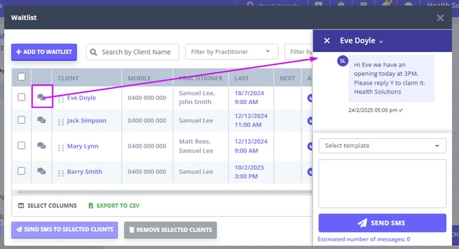 - To send a message to a specific client, and check the messaging history of a client on the Waitlist without leaving the Waitlist screen,