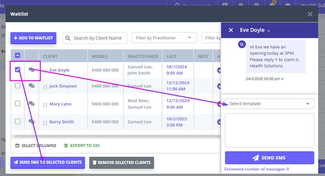 2. Scroll down and select an existing SMS template or type in your message in the field labelled Send SMS to selected clients.