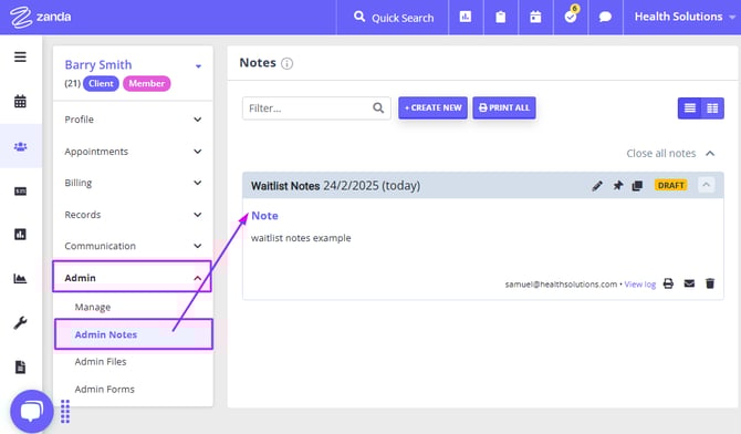 The Waitlist note will be saved in Client Profile > Admin > Admin Notes when the client is removed from the Waitlist and you checked the box when confirming the client removal from the Wailtist: