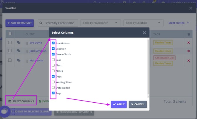 - Tick the columns you would like to be included in the Waitlist view, and select Apply.