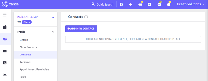 1. Open a client’s profile page to which you want to add a contact. To quickly go to a profile page, type in the client’s name in the Quick Search on top of the Zanda dashboard.