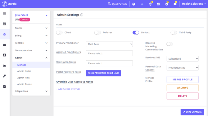 5. If a contact profile is no longer needed in your account, we recommend archiving them. This way no data will be removed from your account in case you needed to store it as part of your clients records. To archive a client profile, open it and navigate to Admin > Manage settings. There, click the ARCHIVE button and follow the prompts to complete this activity.