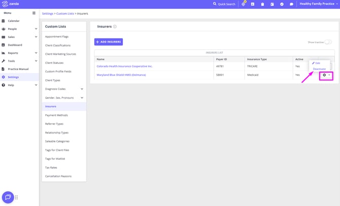 7. Use the 'Actions' column to deactivate an insurer when needed to remove them from the insurers list: