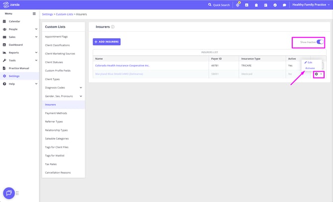 - Click the gear icon in the last column next to an inactive insurer you want to activate