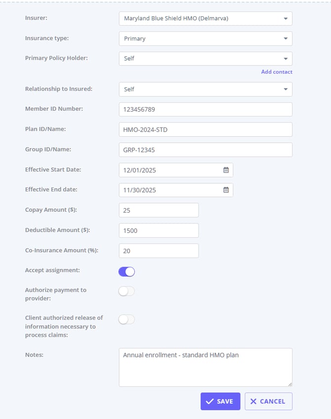 5. The 'Insurance Details' linked profile field will also automatically add the insurance record to the client profile > Billing > Insurance and save all the insurance details the client provided, there.