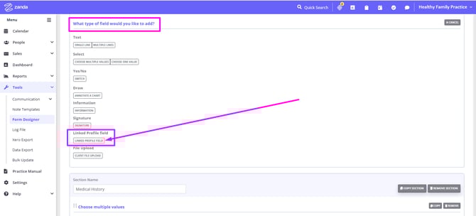 3. In the ' What type of field would you like to add?' section, select the 'Linked Profile field' option.