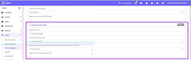 6. You can select the insurer to pre-populate it to your form template, or leave it blank for the clients to choose from your available list of insurers. (This list is set in Settings > Payments > Insurers.
