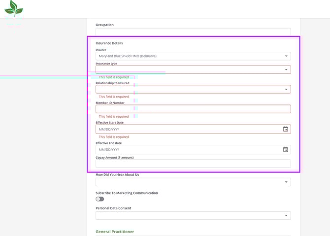 Hint: If you don't make the Insurance Details field a required field, and a client enters some information in it, all the additional fields for collecting the full insurance information will become required, to ensure that a client provides all the needed information.