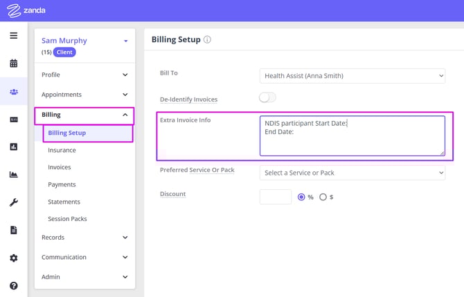 2. Click into the 'Extra Invoice Info' text box and enter the NDIS plan start and end dates: