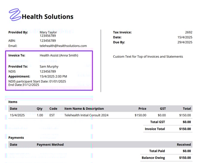 After entering the above NDIS information as we instructed, it will be showing on their invoices when they are printed or emailed: