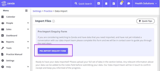 1. On the left-hand side bar, navigate to Settings > Practice > Data Import.