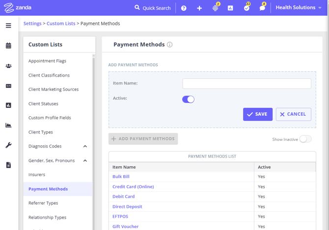 Customize payment methods in Zanda to reflect your preferred payment processors. Add or remove methods like PayPal and Direct Debit.