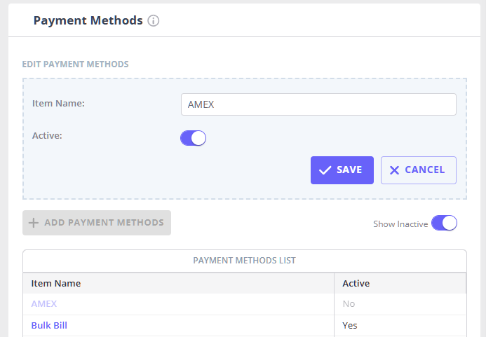 The inactive payment methods will be visible on the list as greyed-out. Find the payment method you want to make active and click on its name to edit.