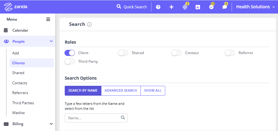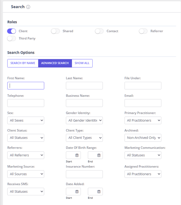 The advanced search functionality is a powerful tool that can be used to generate list of clients, shared profiles, referrers, contacts and third-party profile.