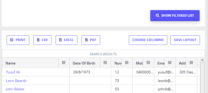 Once you have tweaked the various filters to your liking you can generate the list of clients (or referrers, third parties or contacts) you can click 'Show Filtered List' to generate the list.