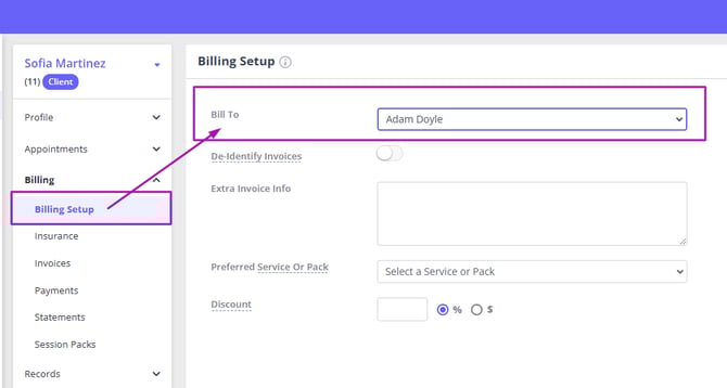 You can set the client contact as their default payee, this will automatically generate invoices where the contact will be listed as the person responsible for paying for the invoices. The detailed setup process is described here.