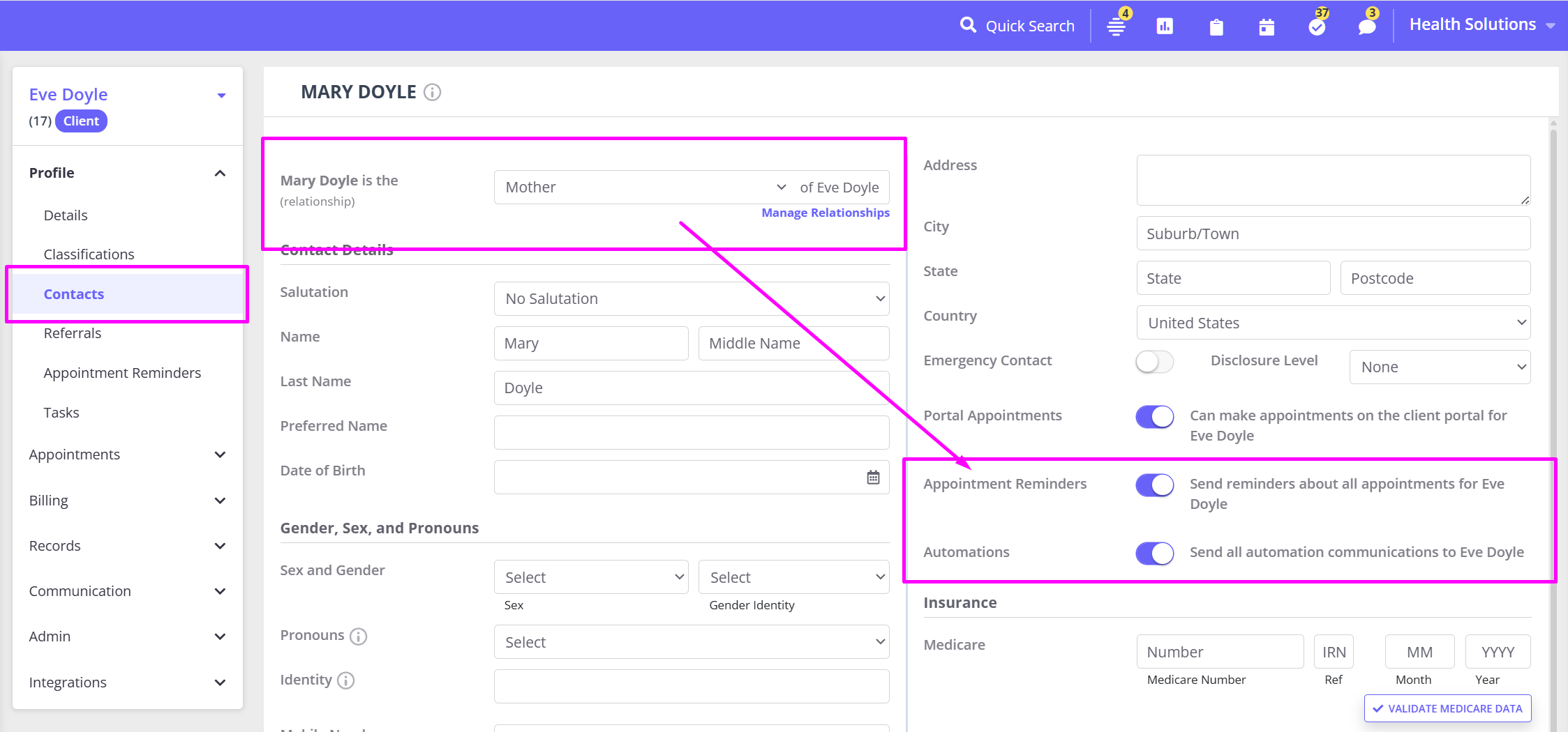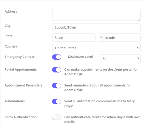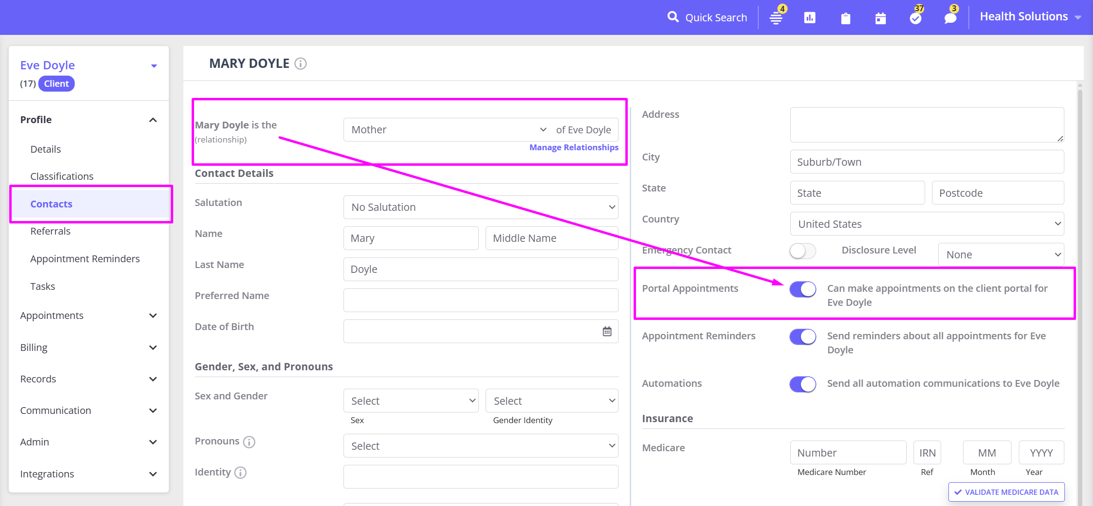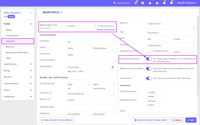You can enhance a client profile by adding a contact who will have the authority to schedule appointments on the client’s behalf. This feature is particularly beneficial when a family member, such as a parent, partner, or child, needs to arrange appointments for someone else. To set this up, follow the steps below.