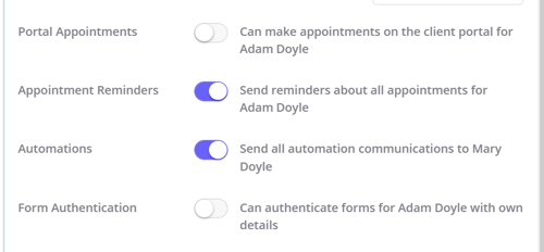 You can toggle on the Appointment Reminders and Automations Communication switches  on the Contact Details page, to send reminders about all client appointments and all clients' automations messages to this contact.