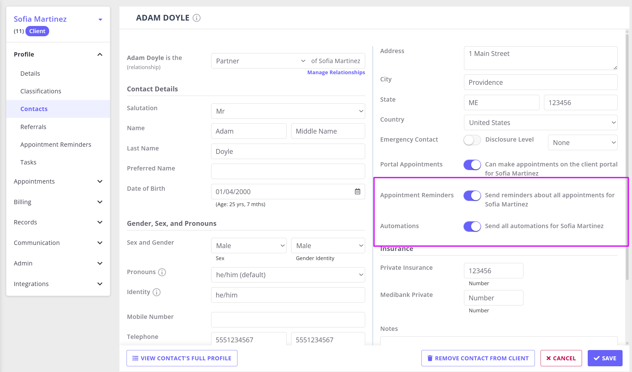 You can toggle on the Appointment Reminders and Automations Communication switches on the Contact Details page, to send reminders about all client appointments and all clients' automations messages to this contact.
