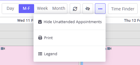 - To access the calendar legend, click the three dots icon at the top calendar tools panel and select Legend: