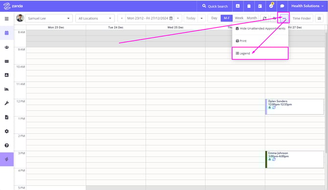 - To access the calendar legend, click the three dots icon at the top calendar tools panel and select Legend: