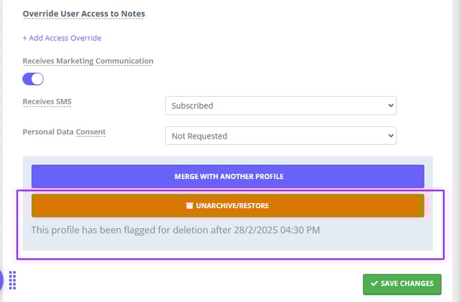 3. Click the yellow Unarchive/Restore button to restore the Client Profile.