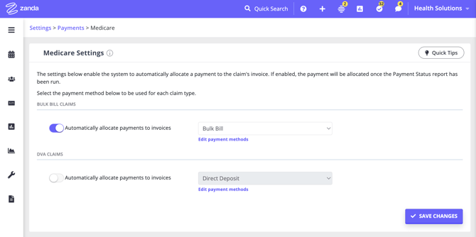 Learn how to enable automatic payment allocations for Bulk Bill and DVA claims in Zanda.