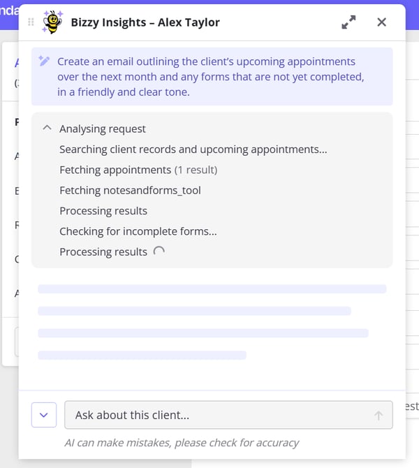 BizzyAI: Insights securely queries your Zanda data (client profile, appointments, notes, forms, invoices, etc.), then passes that information to our AI model to draft content that’s tailored to your request.
