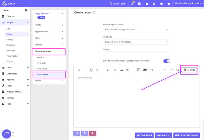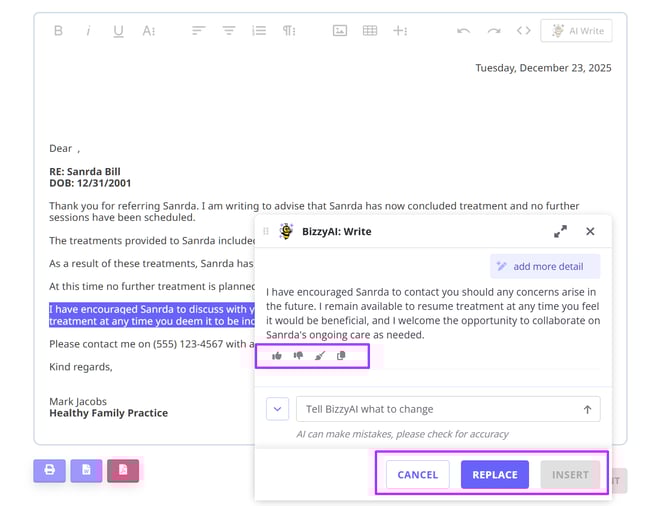 Coming Soon: With BizzyAI: Insights, you will be able to produce letters and emails that reference clinical Information from the clients profile including session notes and more. This functionality is currently in development.