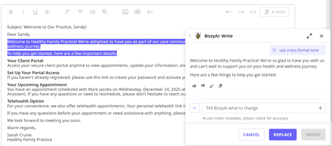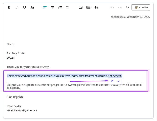 The work on BizzyAI: Write is ongoing and our team are working on introducing Write to email and letter templates, as well as in the practice manual to allow you to use this feature for creating templates and writing policies for your practice. If you've enabled AI features, then you'll gain access to this functionality once it's been released.