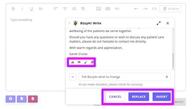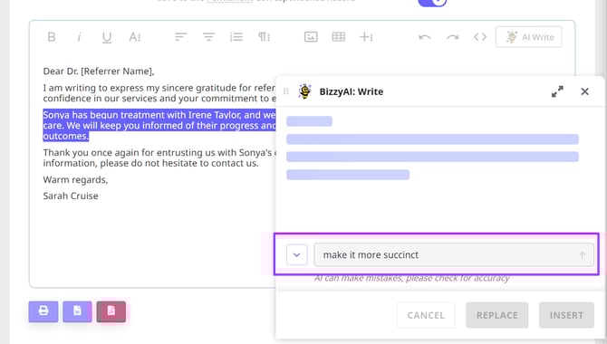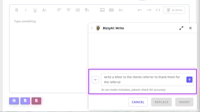 - Type what you'd like BizzyAI: Write to do (e.g. "write a letter to the clients referrer to thank them for the referral")