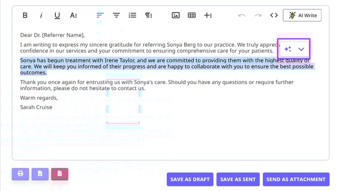 - or by highlighting content in your email or letter and clicking on the AI icon: