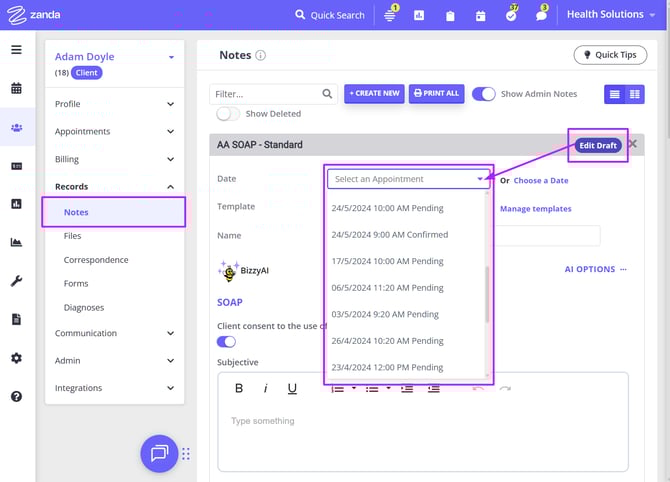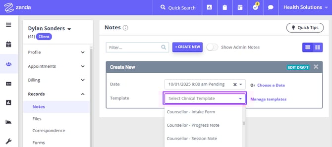 2. You will be moved to the client profile > Records > Notes page, and a new note linked with the appointment will be created. Select the applicable clinical template from the 'Template' dropdown.